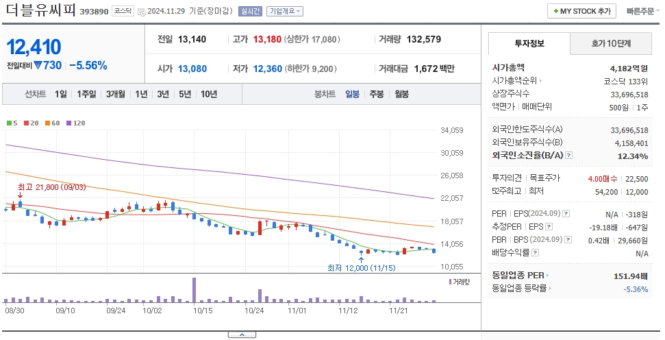 - 삼성 SDI와 2027년까지 약 5조 원 규모의 분리막 공급 계약을 체결하며 안정적인 매출이 기대됩니다. 그러나 최근 업황 불황과 실적 악화로 주가가 최고가 대비 약 77% 하락한 상태입니다.